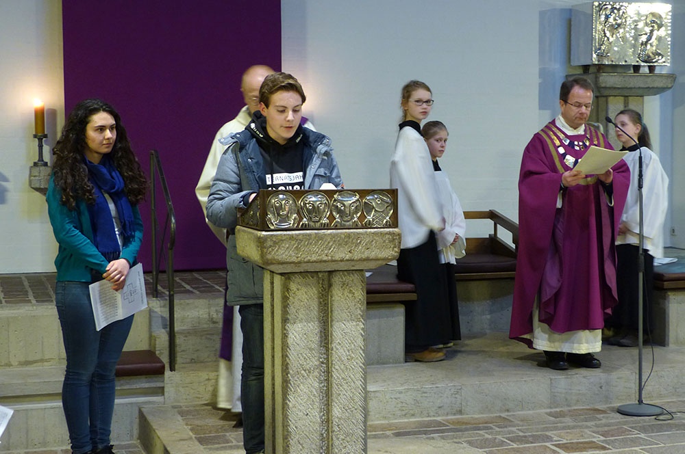 Auch dieses Jahr nahmen die Loburger das Thema des Kreuzweges für ihre Wallfahrt auf. Am ersten frühlingshaften Tag des Jahres startete die Gruppe von ca. 380 Schülern, Eltern, Lehrern sowie Erziehern an der Loburg, um in der St. Bartholomäus-Kirche in Einen einen gemeinsamen Gottesdienst zu feiern. Fotobearbeitungen der Straße Via Dolorosa in Jerusalem, jenem Weg, den auch Jesus vor seiner Kreuzigung bis zum Hügel Golgatha gehen musste, bebilderten diese erste Station. Die schwarz-weiß Fotos zeigten das Alltagsgeschehen auf der Via Dolorosa. Die Bilder, die im Original in der Herz-Jesu-Kirche in München den Kreuzweg bilden, zeigten Orte des Wegs in Jerusalem. Mit der Frage "Wo bist Du!" stand der sehnsüchtige oder auch verzweifelte Ruf zu Gott und zu den Menschen, im Fokus. Das griffen die Texte und Bilder auf: Sie erzählten von der Suche nach Gott und von der Suche Gottes nach dem Menschen. Lieder und Instrumentalmusik dienten als roter Faden der Wallfahrt. Zu Fuß. mit Kreuz und Fackeln bewältigten die Loburger den Weg zurück, wo in der St. Johannes Kirche die letzte Station eingelegt wurde. Nach dem traditionellen Lied „Von guten Mächten“ klang der Abend bei einem kleinen Imbiss in der Pausenhalle aus.