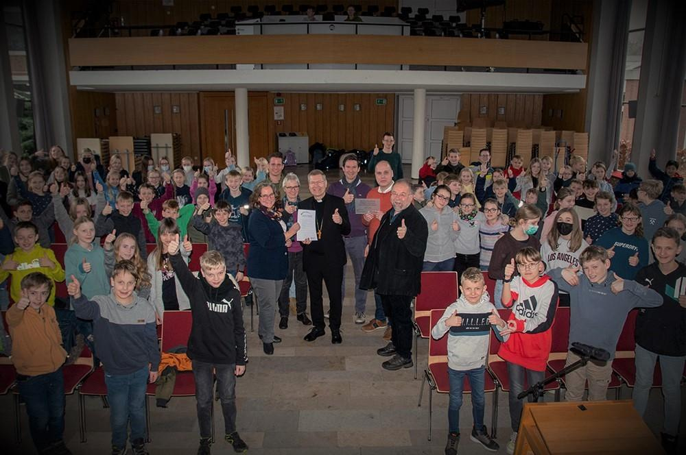Weihbischof Zekorn gratulierte den Schülern und Lehrern zu ihrem Engagement in Sachen Schöpfungsbewahrung. „Mit unserem Verhalten können wir die Zukunft gestalten, es liegt mit in unserer Hand“, betonte er. Seine 5-Finger-Regel, die ihm beim Einkauf hilft, teilte er mit den Schülern: Es gelte, nur die Menge von Lebensmitteln einzukaufen, die gebraucht wird. „50 Prozent der Lebensmittel werden weggeworfen“, brachte er manche Schüler zum Nachdenken. Beim Einkauf stehe für ihn außerdem der Gedanke saisonal und regional sowie nach Siegeln einzukaufen im Mittelpunkt.
