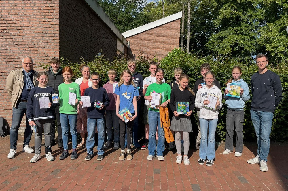 2. Preise konnten Noah Lüffe (5c), Lotta Everwin (5c), Nina Uhlenhake (6a), Felix Stegemann (6a), Hanne Wiemann (6c) und Friedrich Farwick (6c) erringen. Einen 3. Preis erzielten Franziska Cord-Kruse (5c), Philipp Saveliev (6b), Emma Schmidt (6b), Ole Klimek (6c), Johannes Loddenkötter (8c), Clemens Hohenbrink (9a) und Simon Hüttemann (10c).