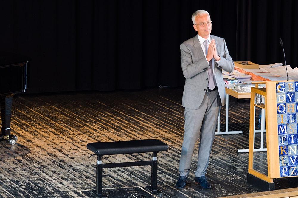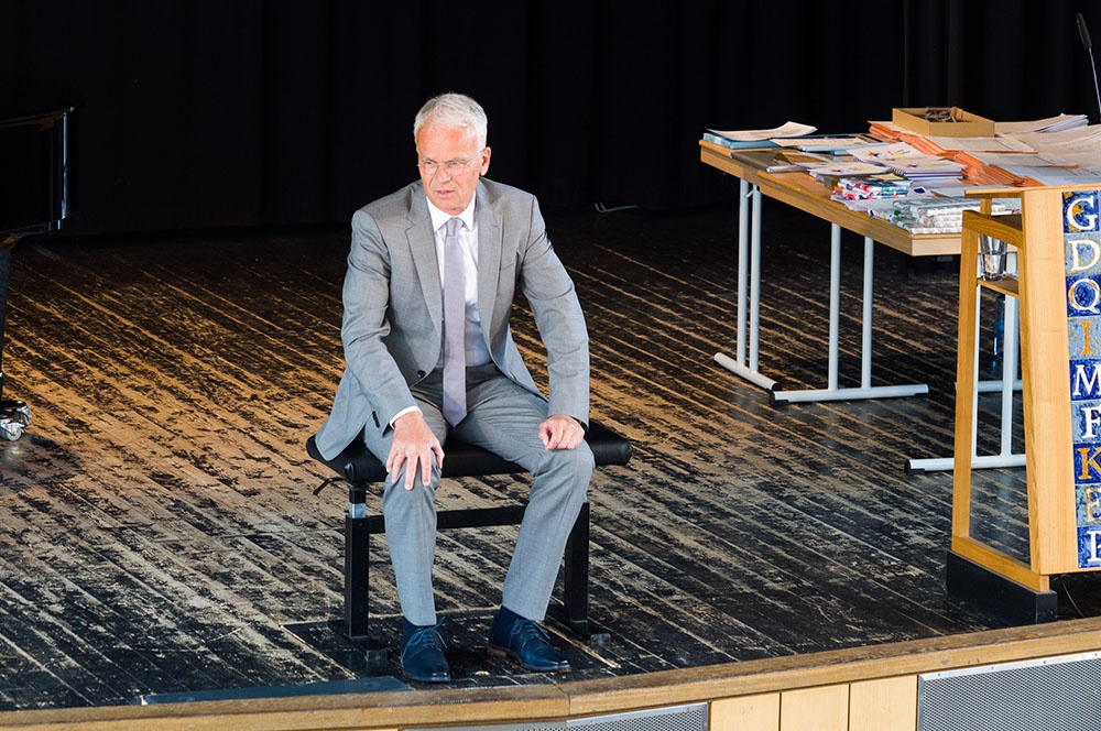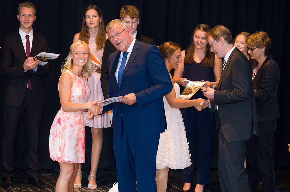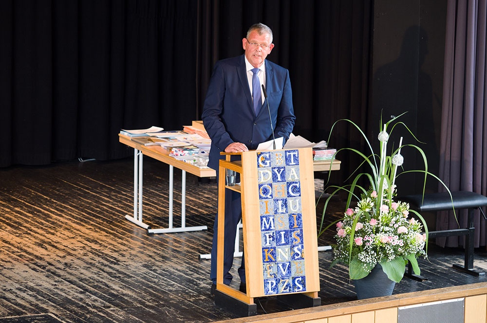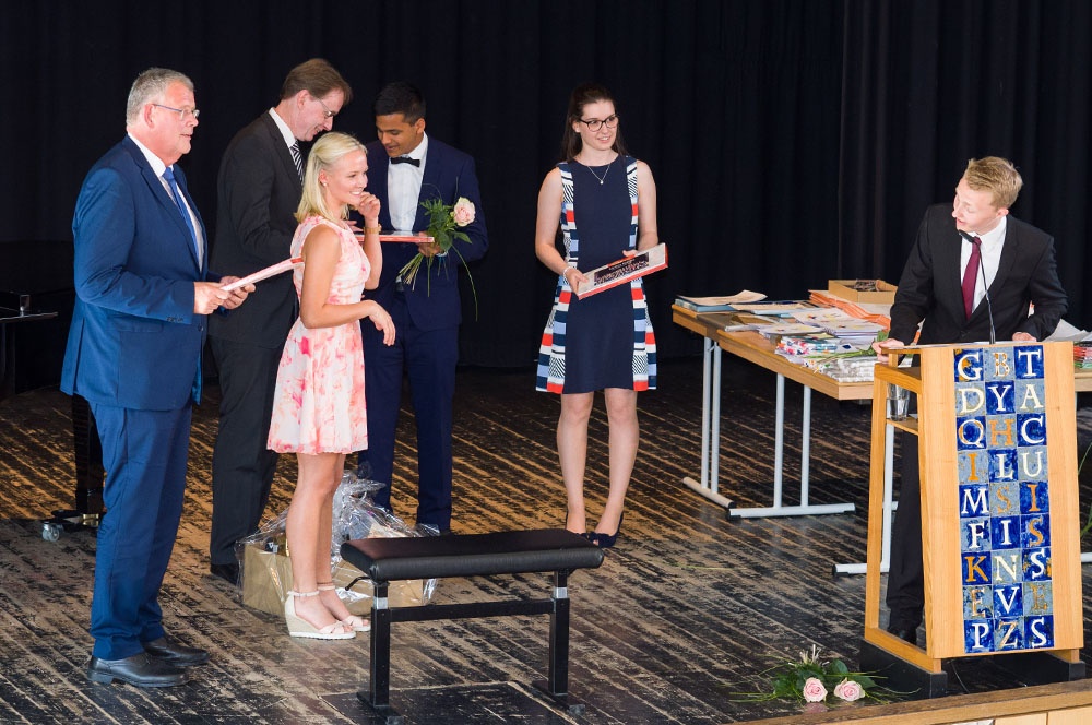 So ließ Aloys Kleine Büning in kleinen Anekdoten die Vergangenheit wieder aufleben und plädierte für das Geschichtenerzählen im Unterricht statt ihn an Kompetenzen auszurichten. Annika Lison und Erik Diekamp betonten das Gemeinschaftsgefühl in ihrer Stufe und erhielten auf der Bühne einen Dank für ihre Arbeit als Schülervertreter.