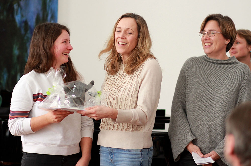 Auch die Fachschaften nutzten die Gelegenheit, die Kollegin zu würdigen: Maria Tipp als Vertreterin der Chemiker hob besonders die von ihr inszenierten explosiven Experimente als „Chemie zum Anfassen“ hervor. Die Sportfachschaft fasste ihre Liebe zum Sport und Sportunterricht in einem umgedichteten Lied zusammen: „Wir lassen dich ungern geh’n, wir woll‘n dich wiederseh’n.“. Beide Fachschaften wünschten ihr für die anstehenden Reisen und die Zukunft alles Gute.