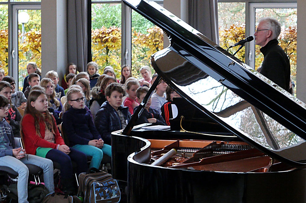 Am Donnerstag war der Pianist Clemens Rave zu Gast an der Loburg bei den Schülern der Jahrgangsstufe 5 und 6. Zunächst mussten die Anwesenden die Zeit für das erste Klavierstück stoppen - 1 Minute 35 Sekunden - antwortete ein Schüler selbstbewusst und Prof. Rave bekannte, dass er für den Minutenwalzer von Chopin damit wohl zu lange gebraucht habe. Im weiteren Verlauf beleuchtete der Pianist das biographische Umfeld von Mozart und gab weitere Infos und Anekdoten zu den Kompositionen. Dabei verstand er es, das Vorwissen der Schüler gut in seinen Vortrag einzubinden. Vielen ist bekannt, dass Mozart mit vier Jahren bereits anfing zu komponieren. Neu war den meisten, dass dieser in den jungen Jahren vorwiegend in freudigen und strahlenden Dur-Tonarten schrieb, während er sein erstes Stück in eher düsterem Moll mit sieben Jahren nach einer schweren Krankheit auf einer Reise nach Holland komponierte.